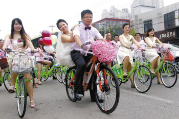 在自行車選用上,劉擎沒少花工夫。為了和環(huán)保更貼近,也為了車輛樣式的統(tǒng)一,他和公共自行車站點方面取得聯(lián)系,在婚禮當(dāng)天租用了16輛綠色公共自行車,分別給伴娘伴郎和朋友騎。同時,騎行人員都統(tǒng)一著裝,一件短袖t恤,胸前一個大大的“囍”字。