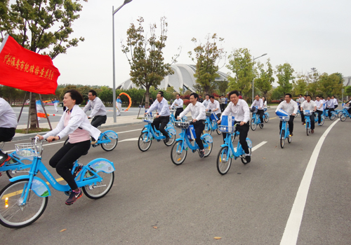 2006年,淮安舉辦了首屆全民健身運(yùn)動會,在全省引起較大反響。本次第二屆全民健身運(yùn)動會由市委市政府主辦,市體育局等7部門承辦,設(shè)4個部28項次比賽,將有一萬多人參加此屆運(yùn)動會。為全方位體現(xiàn)“全運(yùn)會”的特點(diǎn)及宗旨,運(yùn)動會采用了市民大力支持、廣泛參與的自行車環(huán)市行作為開幕式方案,真正體現(xiàn)了“全民健身全民參與”和“全民健身你我同行”的主旨。開幕式結(jié)束后,淮安市領(lǐng)導(dǎo)與萬余名市民共同參加騎自行車環(huán)市行活動。市領(lǐng)導(dǎo)們帶頭騎行在隊伍的最前面,全市近百個單位共萬余人組成113個方隊,緊跟在市領(lǐng)導(dǎo)方隊后騎行。自行車隊伍所到之處一片歡騰,整齊干練的著裝,精神抖擻的風(fēng)貌,意氣風(fēng)發(fā)的笑臉……祥和而熱鬧。而公共自行車的加入更是為活動增添了一道亮麗的風(fēng)景線,藍(lán)色的倩影在壯大的隊伍中顯得格外亮眼。引來了許多群眾駐足觀看,大家用掌聲和歡呼為隊伍加油助威。