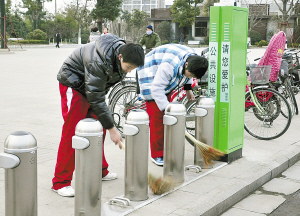 中國(guó)徐州網(wǎng)-都市晨報(bào) 昨日下午,二十六中15名初中生來(lái)到九龍湖公共自行車(chē)停放點(diǎn)義務(wù)擦車(chē)。