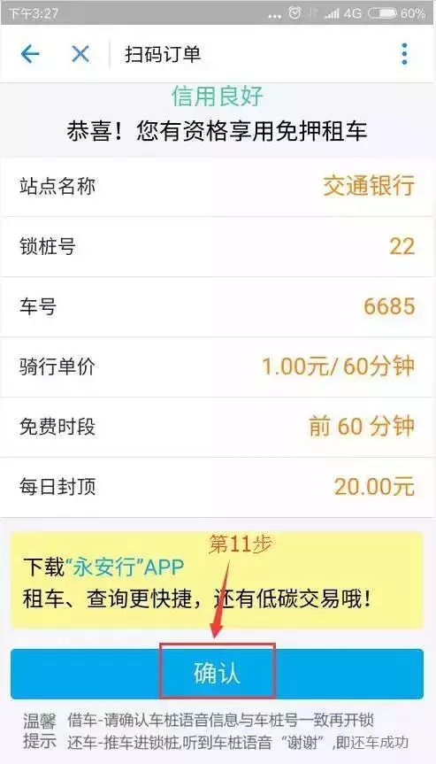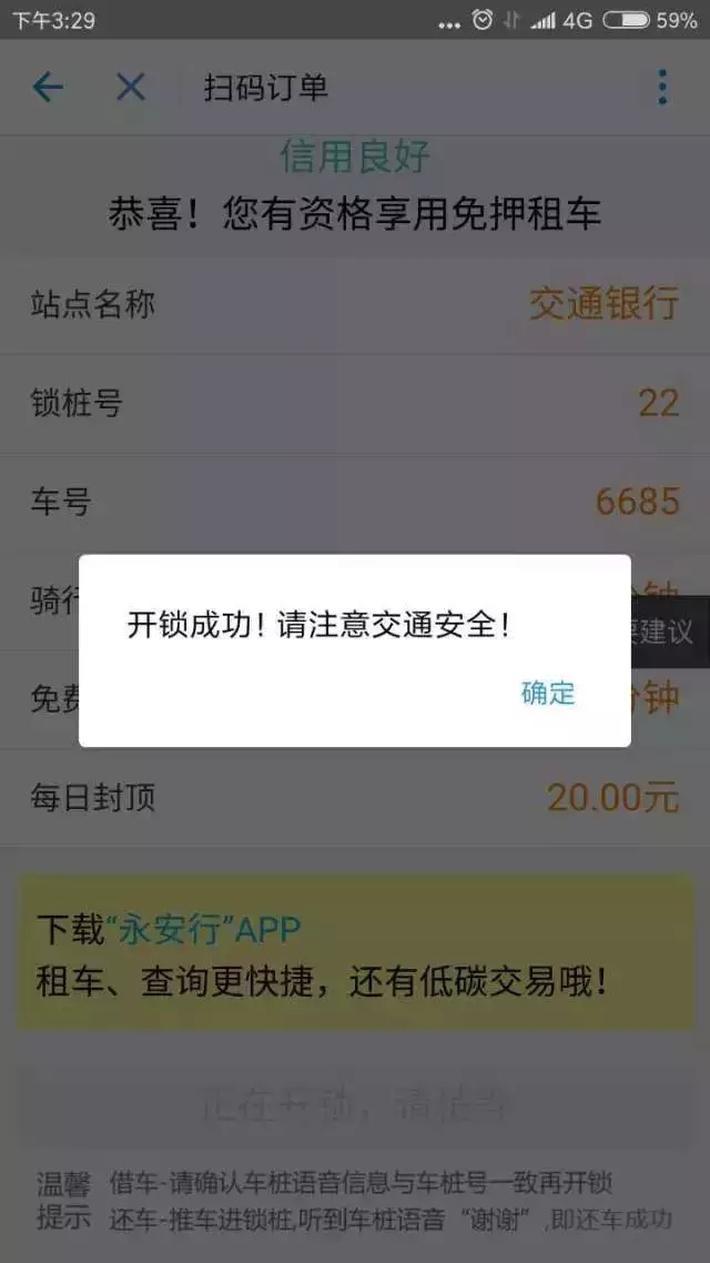 9、填寫(xiě)好支付密碼后,跳轉(zhuǎn)的界面上,我們可以看到上面有站點(diǎn)名稱、鎖樁號(hào)、車(chē)號(hào)、騎行單價(jià)、免費(fèi)時(shí)段以及每日封頂。