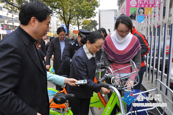 在大市口廣場上,朱曉明、雷志強一行首先閱讀了標注有公共自行車使用方法和車位分布圖的展牌。朱曉明要求市城管部門更廣泛地宣傳使用方法和車位分布圖,讓更多市民知曉,并在試運行的一個月中及時聽取他們的意見和建議,隨時加以改進,以便5月1日正式運行時給市民帶去更多方便。隨后,朱曉明、雷志強及有關(guān)部門負責(zé)人來到位于房產(chǎn)交易中心外的車位上各自取了一輛自行車騎上了解放路。