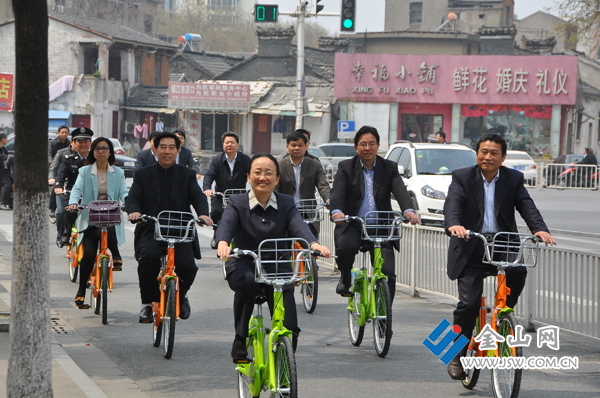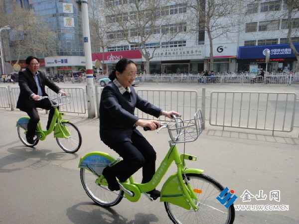 金山網(wǎng)訊 “在路上騎自行車,感覺很舒服!”昨天上午,市長朱曉明騎著公共自行車,在解放路上騎行一段下車后對記者說。隨著朱曉明、雷志強等市領(lǐng)導(dǎo)騎車上路,第一批1000輛公共自行車開始為市民服務(wù)。